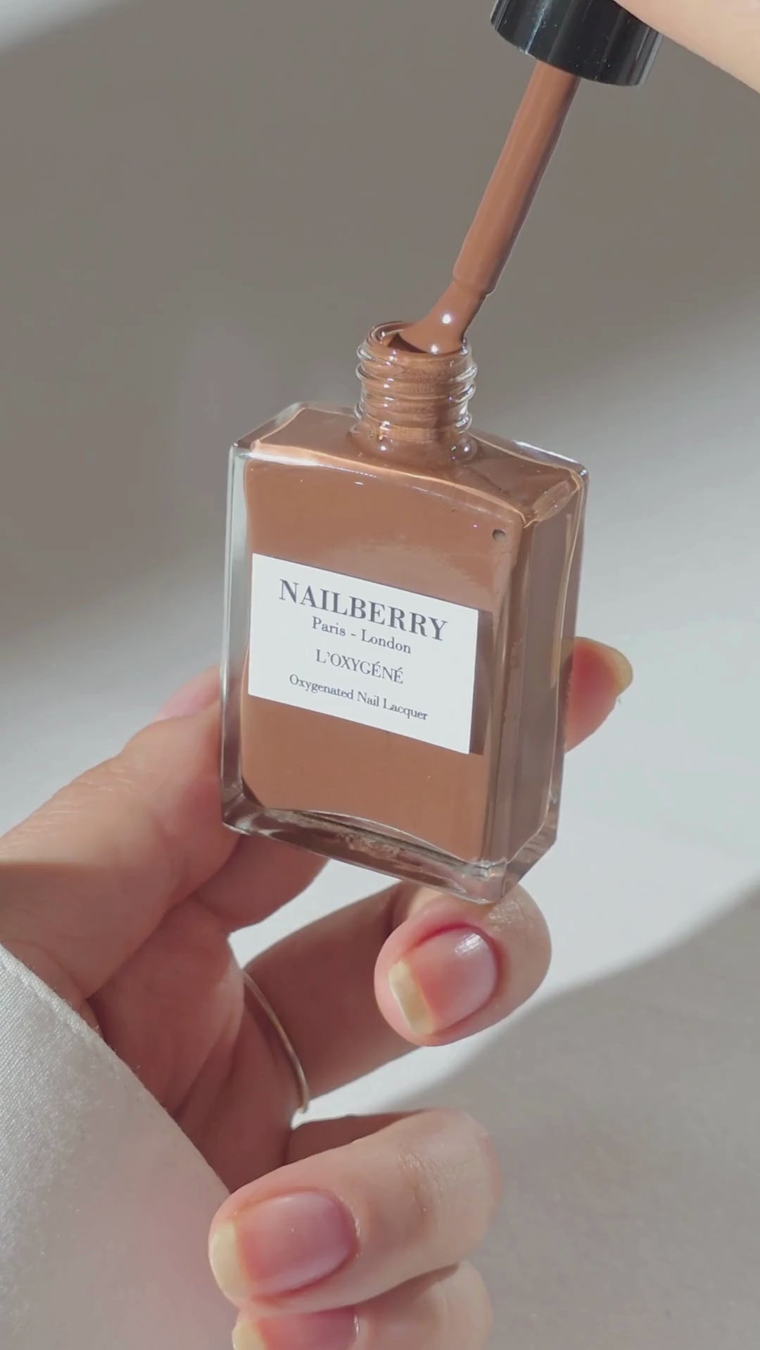 Dip brush into chosen L’Oxygéné Colour, remove excess from brush, then apply one thin layer to each nail. Allow 2-3 minutes to dry, then apply a second thin layer to each nail and allow to dry.