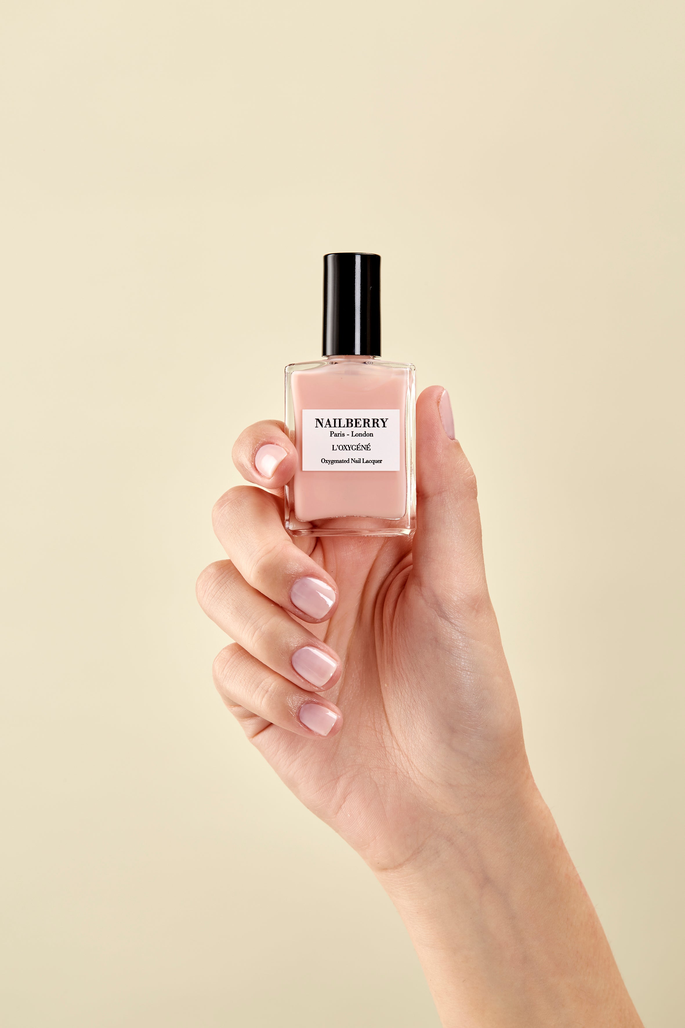 Dip brush into chosen L’Oxygéné Colour, remove excess from brush, then apply one thin layer to each nail. Allow 2-3 minutes to dry, then apply a second thin layer to each nail and allow to dry.